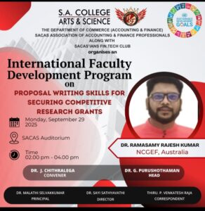 Renowned international resource person, Dr. Ramasamy Rajesh Kumar (NCGEF, Australia), will guide participants in Learning the essentials of drafting competitive research proposal writing, structuring, and strategies to secure competitive research funding.