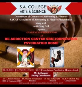 We are pleased to inform you that an *Awareness Programme on De-Addiction* will be conducted on *Wednesday, 20th August 2025, from **12:30 p.m. to 2:00 p.m.* at *SRN Foundation Psychiatric Home, Avadi*.