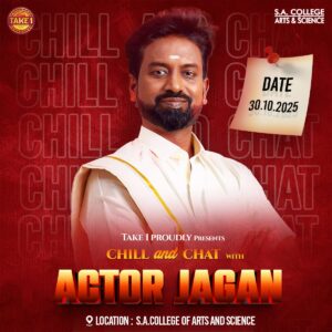 We are delighted to inform you that Mr. Jagan, the popular Tamil film actor and television personality, will be visiting SA College of Arts and Science on 30th October 2025 for an exclusive Fan Interaction Session! π