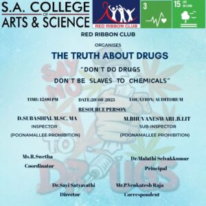 Join us as we come together to say NO to drugs and YES to life, on from 12:00 PM to 2:00 PM, on ( 20/08/2025 ) at the SACAS Auditorium. Let’s break the silence, speak the truth, and take a stand—because every life is precious, and every choice matters.