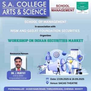 The School of Management, S.A. College of Arts & Science in association with NISM and Geojit Foundation Securities organises Workshop on ”Indian Securities Market” on 17.09.2025 to 18.09.2025 from 9.00 am to 3.00 pm at SACAS Theatre.