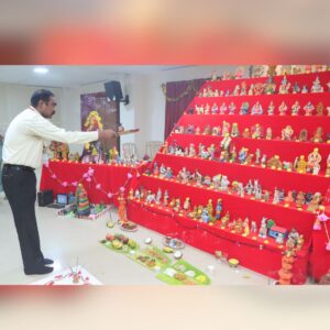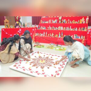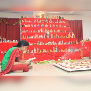 The second day of the Golu celebrations at our college was marked with devotion, creativity, and cultural vibrancy. The Department of Computer Science, Computer Science Application and Computer Science with AI staff and students took the lead, with Pooja performed under the guidance of the Heads of the Departments Mr.Chandrasekar.P and Mr.Krishnan.R. The rituals invoked blessings for wisdom, harmony, and innovation. Students enriched the day with cultural performances. A graceful classical dance by Ms.Rakshitha and team ( III BCA ) rooted in Natya Shastra (IKS) highlighted tradition, while a devotional song sung by Ms.Lakshana ( II BCA) uplifted the spiritual mood. A student also delivered an inspiring slogan by Mr.Dharshan Raj ( III B.Sc CS), connecting values of unity, sustainability, and responsibility. Adding uniqueness, students showcased innovative Golu displays. They created a forest miniature representing India’s age-old ecological wisdom, where nature is revered as sacred, representing and emphasizing the balance between humans and the environment (IKS). spreading awareness on nature conservation, reflecting SDG 15: Life on Land. To represent their department, students designed and placed a computer model and a robot made of cardboard, symbolizing technology, creativity, and problem-solving, aligning with SDG 9: Industry, Innovation, and Infrastructure and signifies the IKS philosophy of integrating tradition with innovation.
