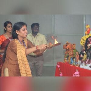 The fourth day of the Golu Celebration was jointly organized by the Department of Psychology and B.Com CS on campus. The event reflected the integration of tradition, devotion, and cultural wisdom, highlighting the significance of the Indian Knowledge System in fostering holistic learning and values. A soulful devotional song performance was presented by Mathisri, Sharmila, Kalaivani, Kousalya, and Haripriya from the Department of Psychology. Their melodious rendition created a serene spiritual ambience, invoking cultural pride and reverence for heritage. The celebration was aligned with the Sustainable Development Goals (SDGs),particularly:
